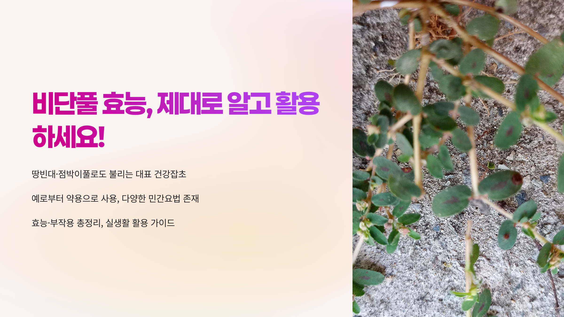 땅빈대 또는 점박이풀이라고도 불리는 비단풀은 예로부터 민간에서 약용으로 꾸준히 사용되어 왔습니다. 오늘 이 시간에는 많은 분들이 궁금해하는 **비단풀 효능**과 함께 혹시 모를 **비단풀 부작용**까지 꼼꼼하게 살펴보겠습니다. 작은 관심이 건강을 위한 큰 발견으로 이어질 수 있습니다.